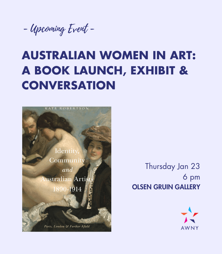 AWNY invites you to the Olsen Gruin Gallery for a conversation on the history of Australian artists through the lens of an intriguing new book, launched by talented Australian author, Kate Robertson. Guests will also receive a special preview of In Sight, an exciting new exhibit at the gallery.